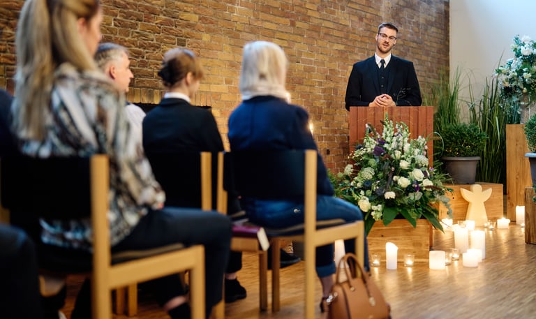 Als Kind und Jugendlicher stand ich als Musiker mit meiner Band schon oft auf der Bühne und habe gelernt, ein Publikum zu tragen und durch den Abend zu führen. Erst durch die Corona-Pandemie hat es sich dann mehr oder weniger zufällig ergeben, dass ich als Bestatter für Trauerredner eingesprungen bin. Zum Glück war ich der Situation durch mein Studium der Theologie, der Germanistik und der Philosophie gewappnet und habe schnell gemerkt, dass das mehr als eine bloße „Aufgabe“ oder eine „Pflicht“ für mich ist. Heute habe ich meine Berufung gefunden und darf selbst immer wieder durch eure Lebensgeschichten lernen. Danke, dass ich deine Stimme sein darf, wenn dir selbst die Worte fehlen.